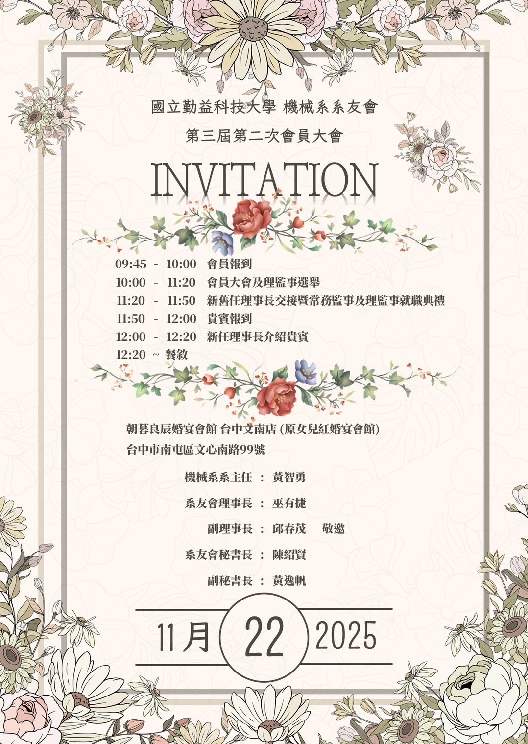 活動紀實傑出校友校友動態恭賀校友總會邱春茂理事長就任第四屆國立勤益科技大學機械工程系系友會理事長Byalumni_adminOn2025 年 11 月 22 日In活動紀實, 傑出校友, 校友動態 114年11月22日由黃尚煜校長及陳錦發董事長帶領文教基金會,家長會,校友總會参加第四屆國立勤益科技大學機械工程系系友會交接典禮,感謝邱春茂理事長不辭辛勞擔任肩負多項重任。 上一 文章 恭賀興采化學循環技術獲 R&D 100 國際大獎 突破複合機能布料「不可回收」世紀難題 下一 文章 臺中市育英國中與臺中高工校友總會工業小巨人獎學金計畫簽約儀式 發佈留言取消回覆發佈留言必須填寫的電子郵件地址不會公開。 必填欄位標示為 * 名稱 * 電子郵件 * 網站 新增留言 * 將我的姓名、電子郵件和網站保存在此瀏覽器中,以便下次留言時使用。 我同意 隱私權政策 發佈留言