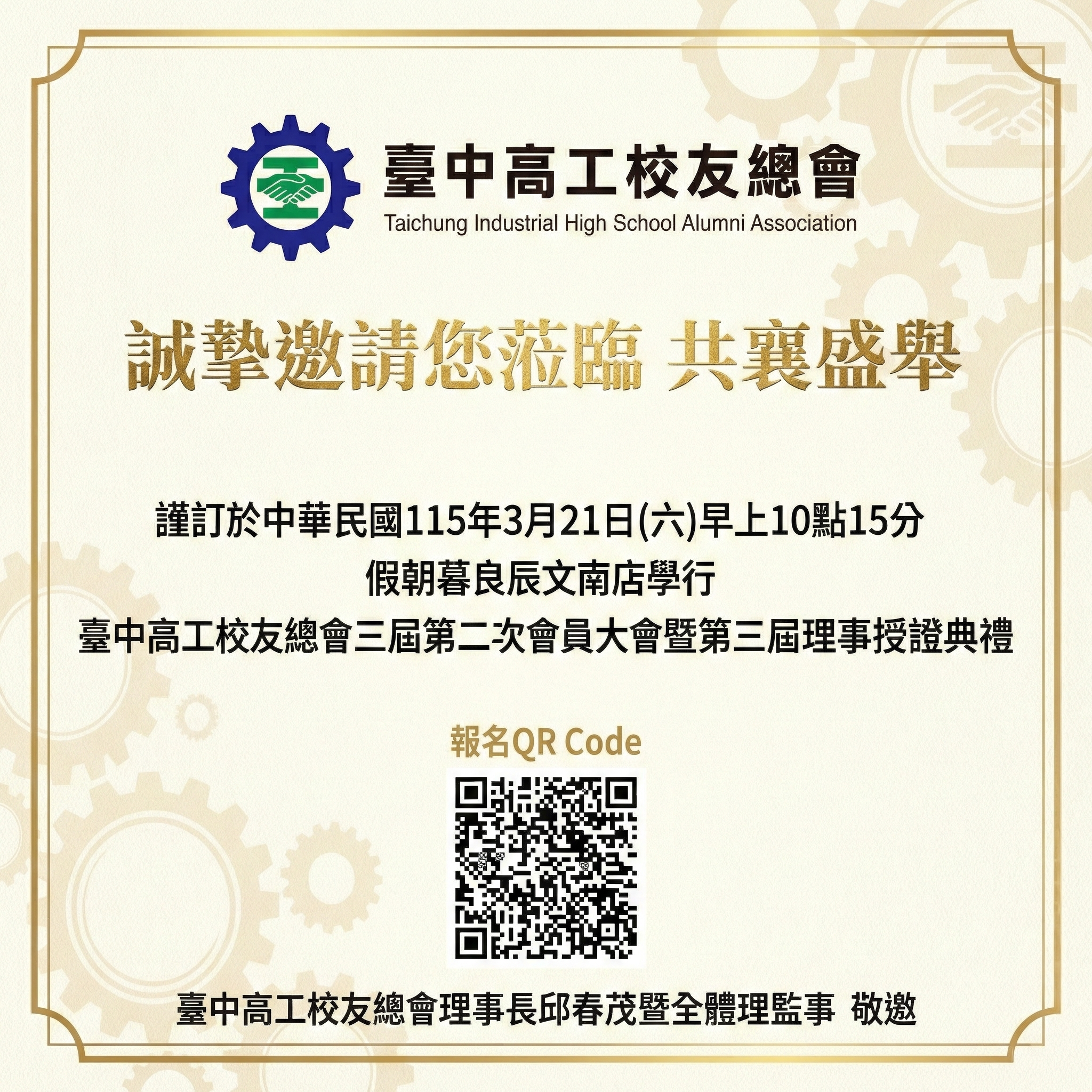 臺中高工校友總會理事長 邱春茂暨 全體理監事 敬邀